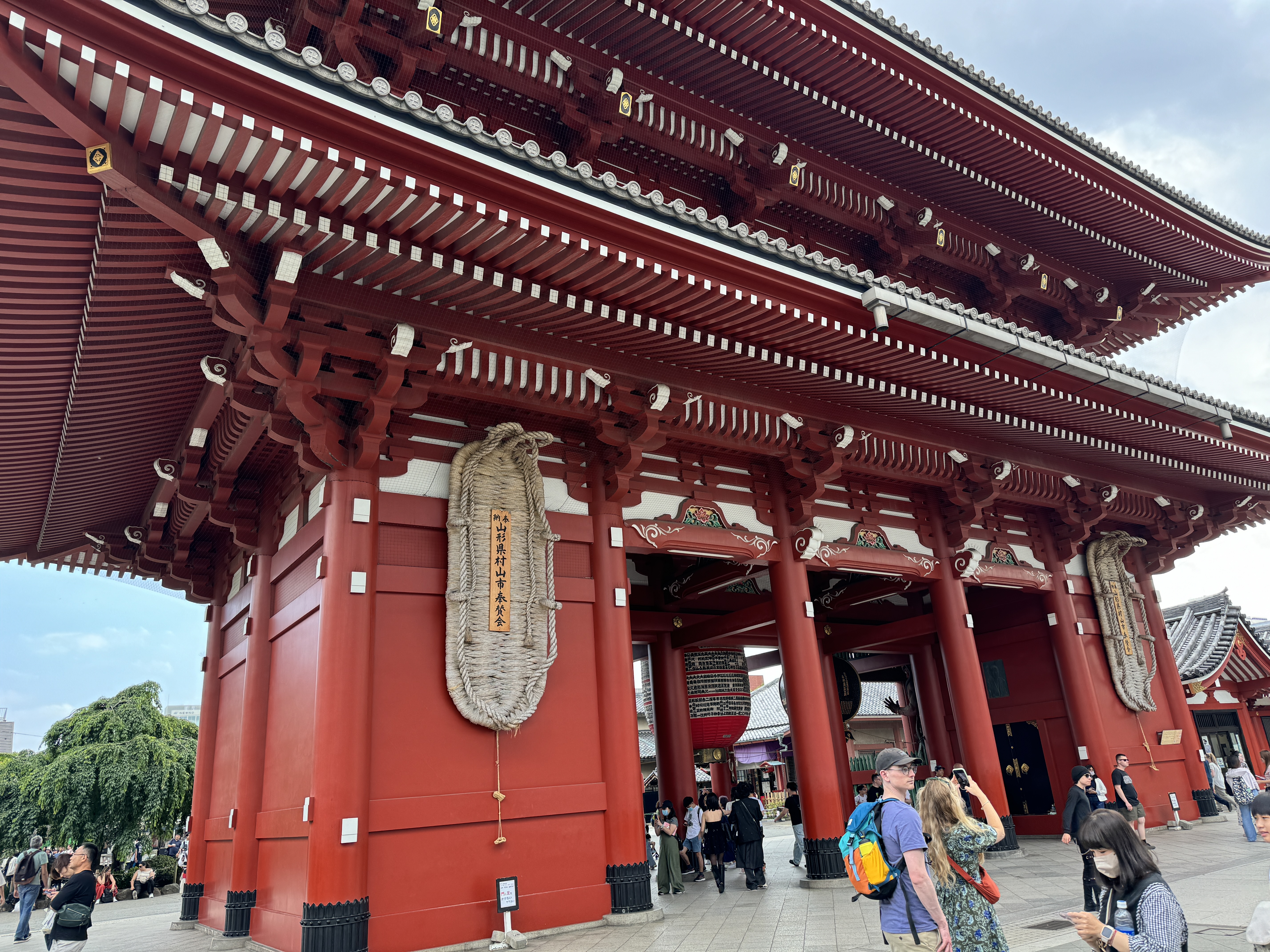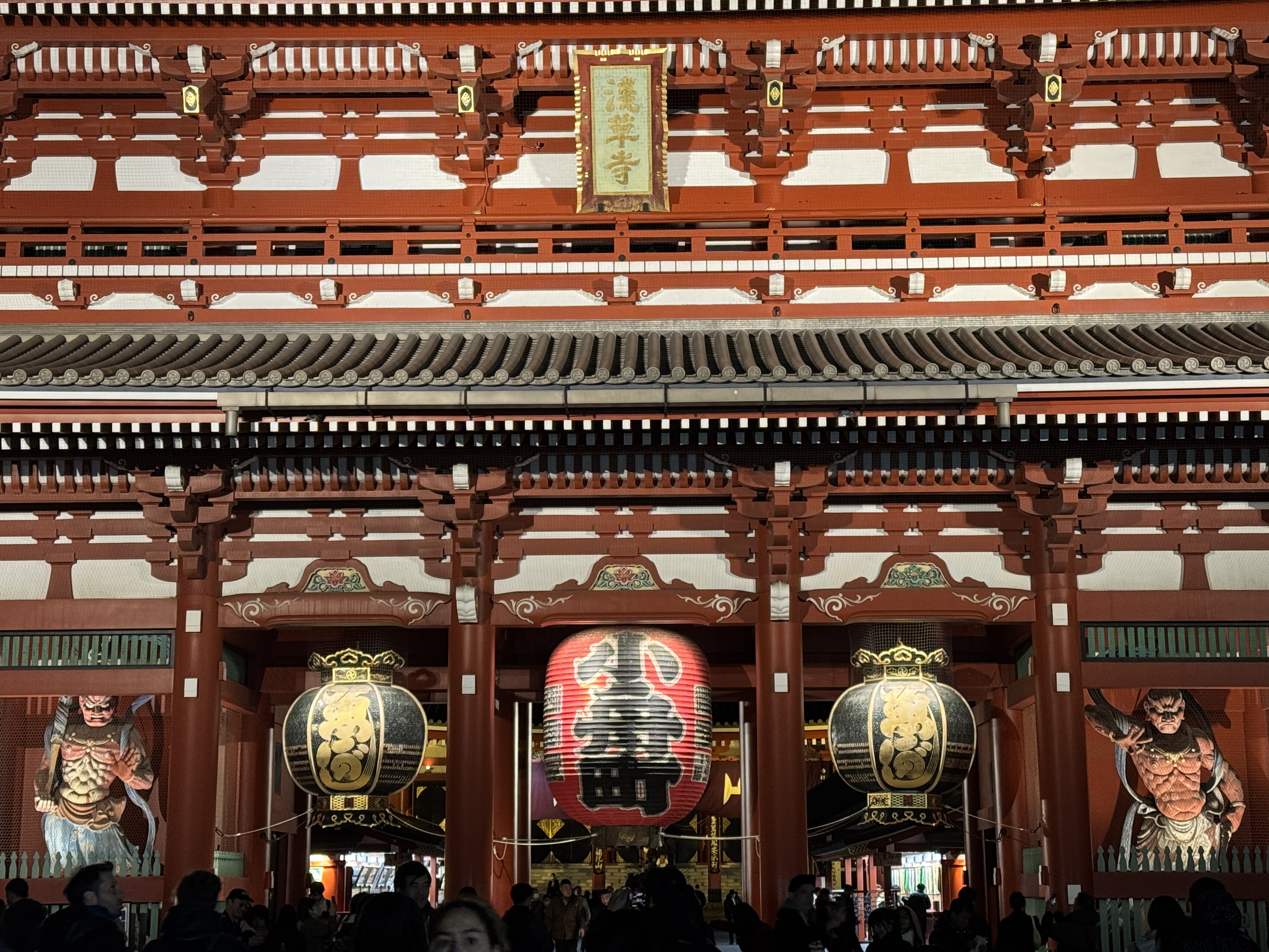 햇살이 부드럽게 내려앉은 거리가 눈앞에 펼쳐졌습니다. 멀리서도 눈에 띄는 거대한 붉은 등롱, 가미나리몬(雷門)이 여행의 시작을 알립니다.