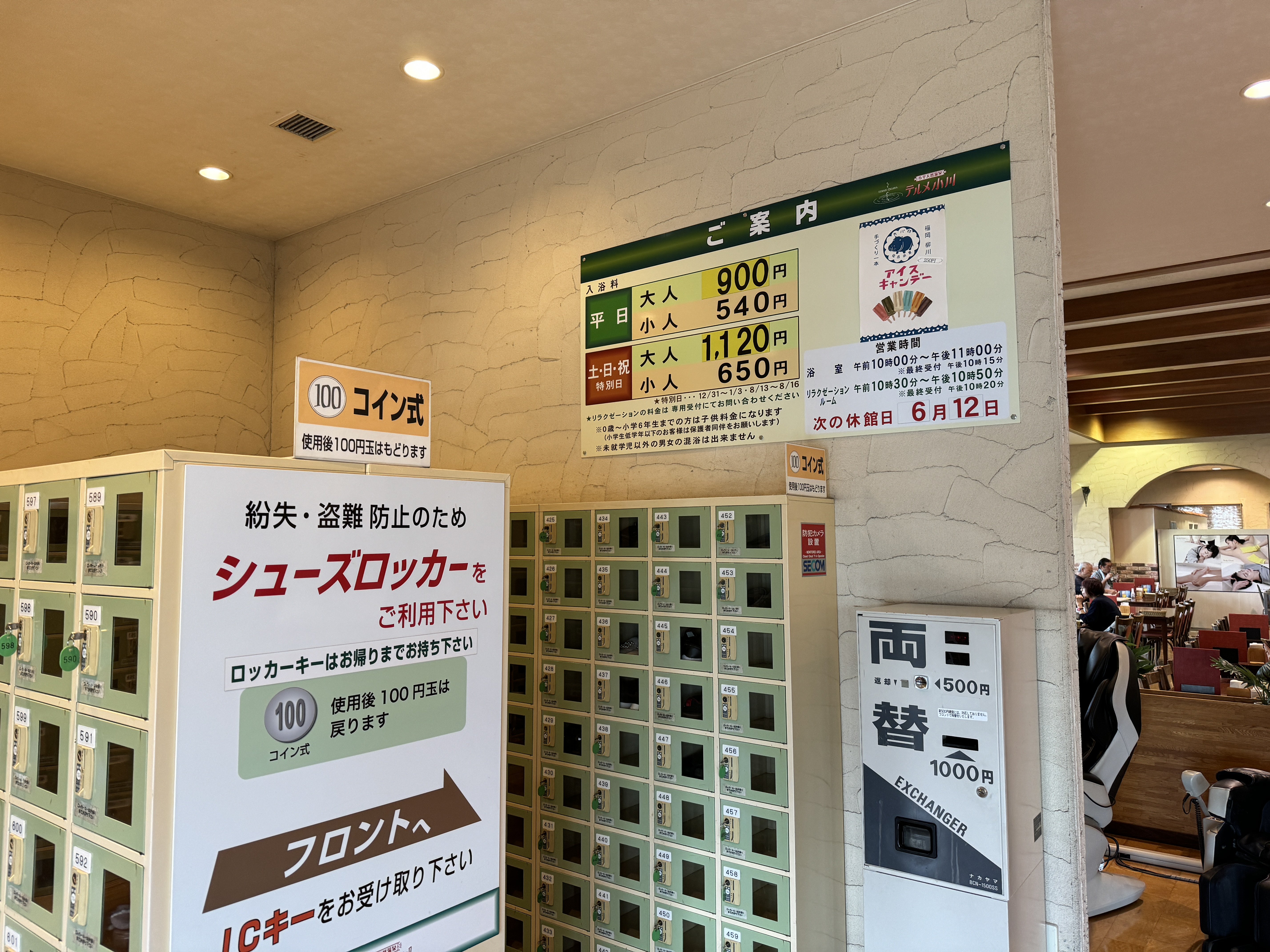 신발 락커는 100엔(퇴장 시 반환). 시설 내 이용료는 모두 퇴관 시 정산(후불)입니다.