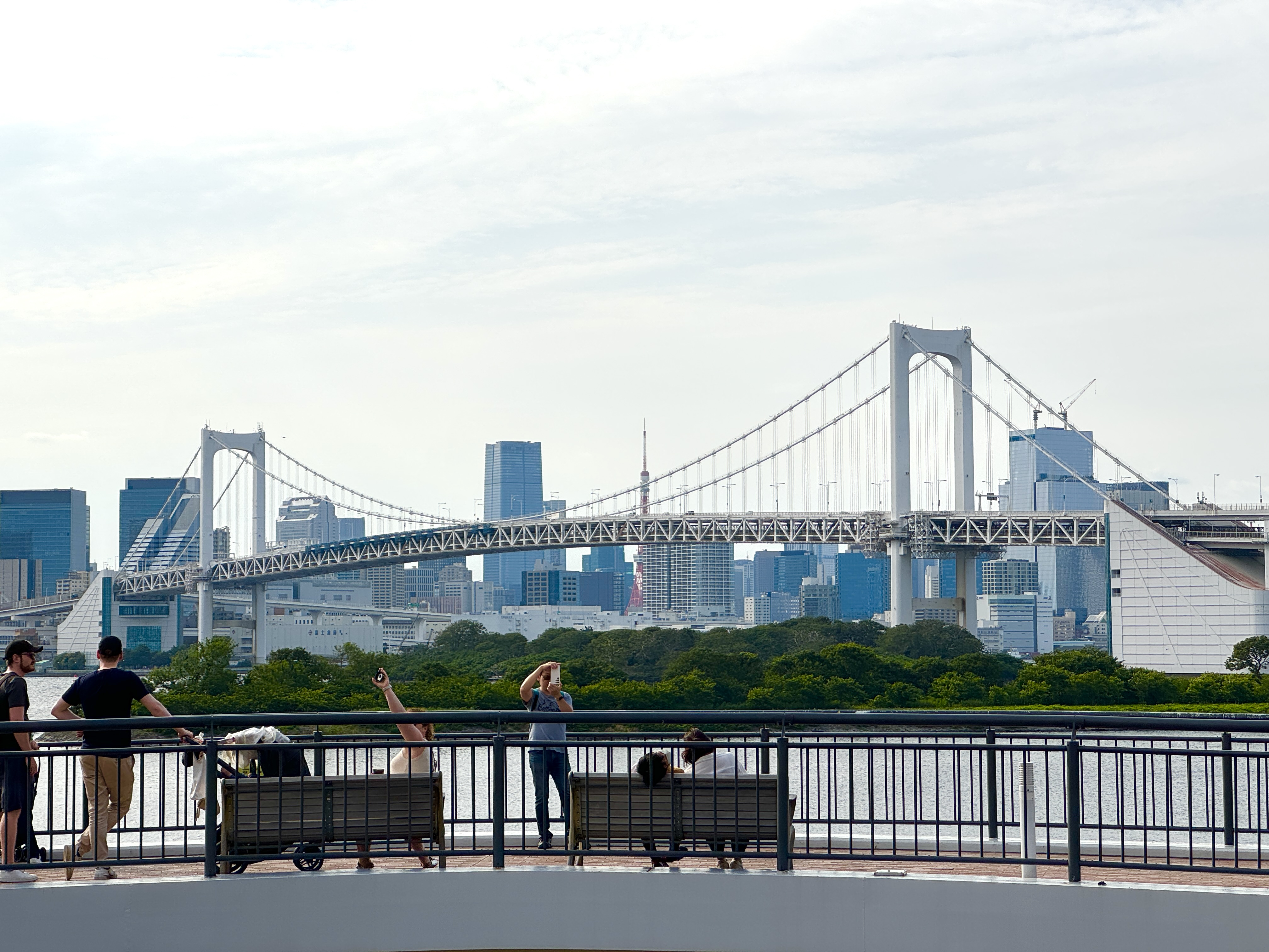 오다이바 해변공원에 서면 눈앞에 펼쳐지는 압도적인 레인보우 브리지와 시내 경관이 보이며 산책로와 작은 자유의 여신상이 있는 해안가의 녹지이다. 하얀 교각과 바다 위로 반짝이는 물결, 그 뒤로 보이는 도쿄의 빌딩 숲.
