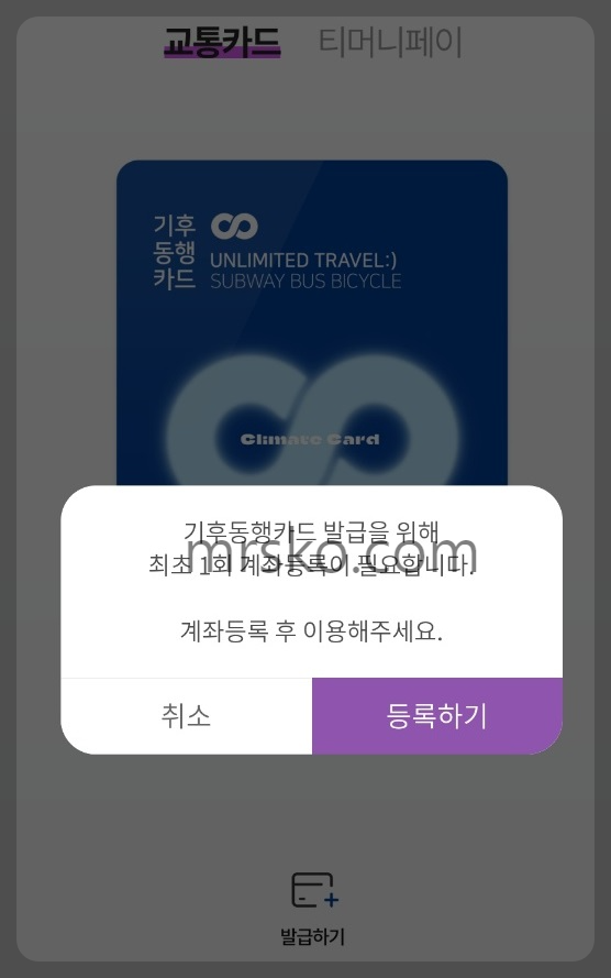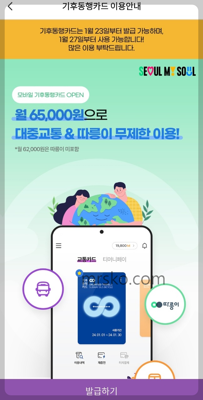 이번 시범사업에서는 안타깝게도 아이폰 이용자는 사용이 불가능합니다. 안드로이드폰 이용자를 대상으로 진행하기 때문에 아이폰을 이용하시는 분들은 실물카드를 이용하셔야 합니다. 안드로이드폰에서 '모바일티머니'앱을 무료로 다운로드하여 회원가입을 진행하신 후 첫 메인 화면에서 기후동행카드를 선택하시고, 계좌등록을 최초에 한번 진행하신 뒤 계좌이체 방식으로 충전하고 이용하시면 됩니다.